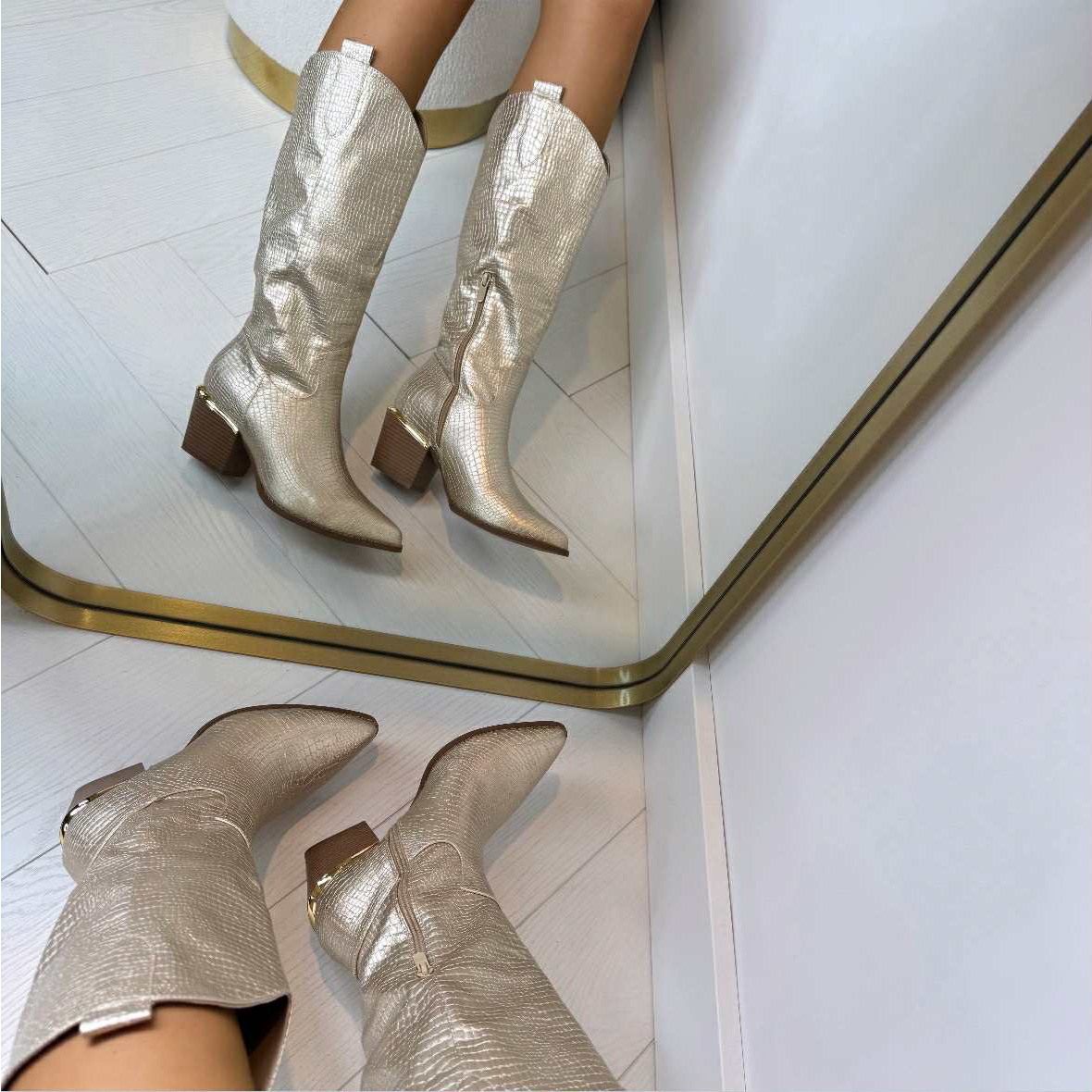 WAUWWW, wat een PRACHTIGE laarzen! SUPER mooie croco print, beetje shiny en een gave gouden kleur! Er zit een brede stevige hak onder, waardoor de laars SUPER lekker loopt!