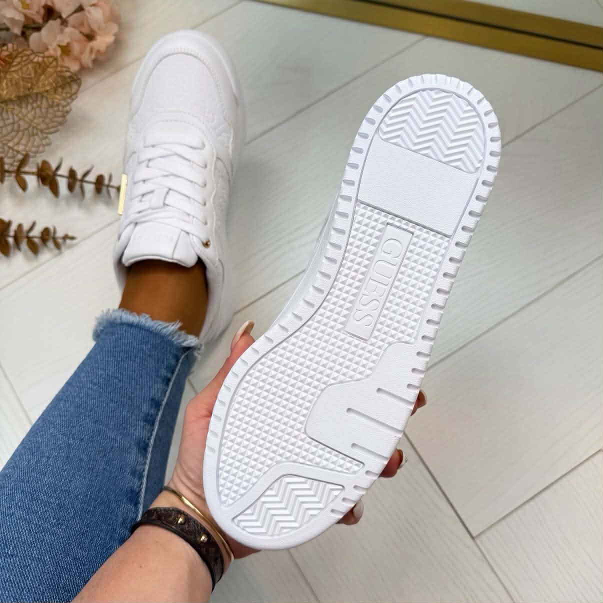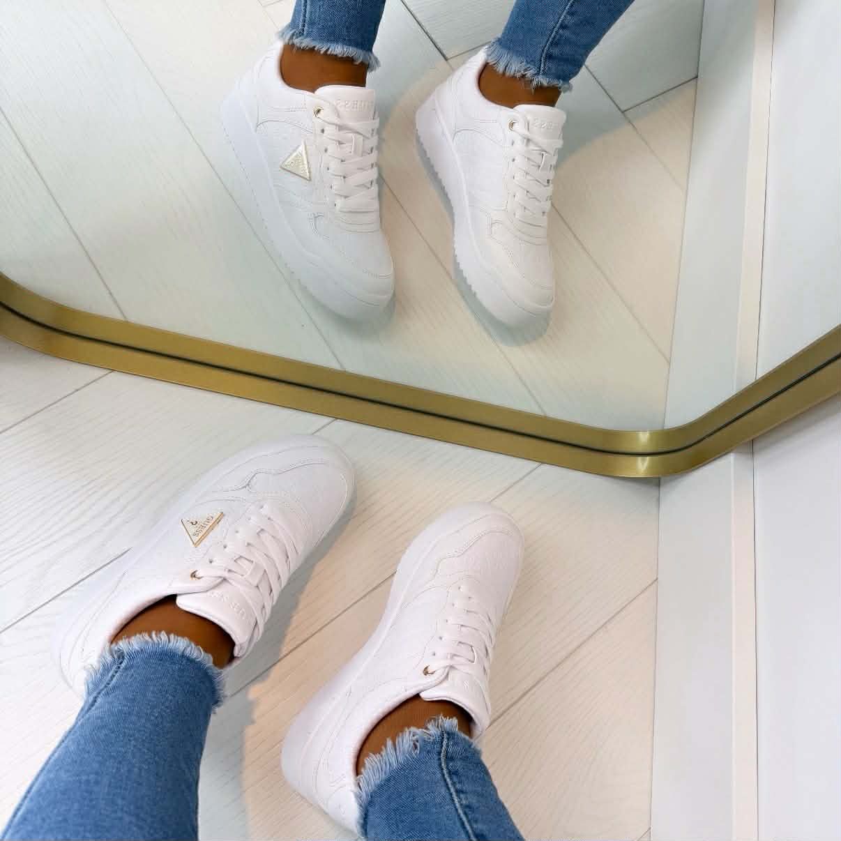 We hebben super gave sneakers binnen van het merk Guess. De sneakers zijn gemaakt van mooi materiaal, heeft duidelijk allover logo patroon en is prachtig afgewerkt met goude details om de schoen af te maken!
