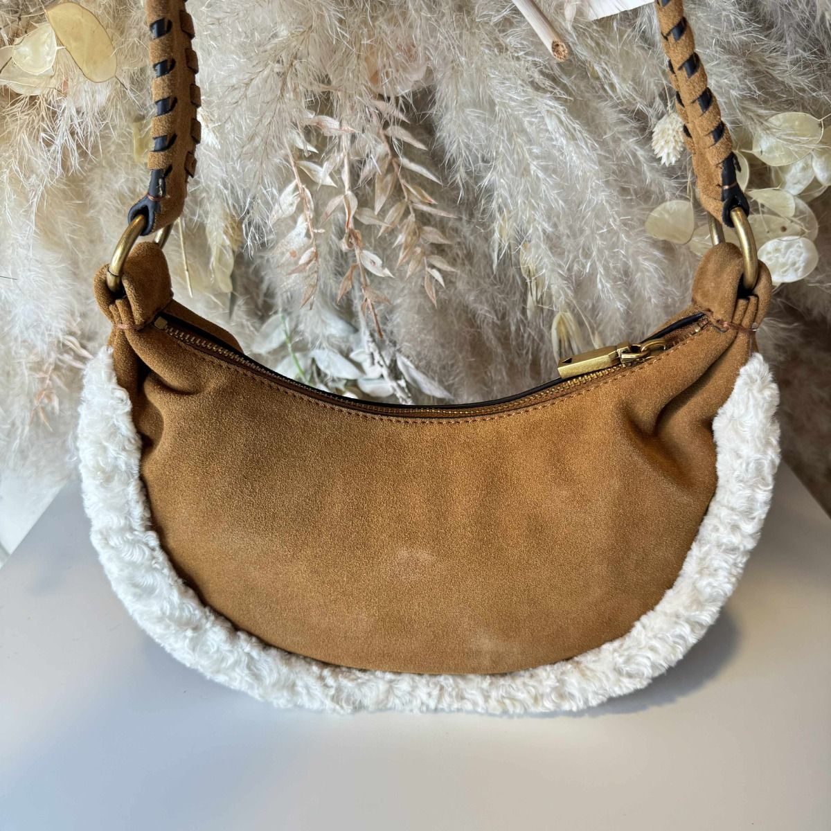 Super gave suedine tas van het merk GUESS met een teddy randje! De tas heeft een ritssluiting, zodat al je spulletjes veilig opgeborgen zitten. Binnen in de tas heb je nog een ritsvakje en 2 aparte vakjes om je spulletjes netjes te sorteren. Ook heeft de tas aan de achterkant nog een handig vakje met een ritssluiting.