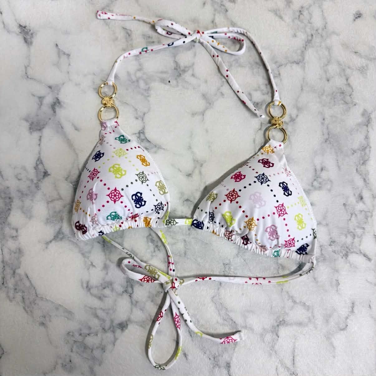 We hebben inmiddels weer een SUPER gave collectie binnen van Guess BEACH! Deze collectie zit vol leuke printjes, rhinestones en leuke kleurtjes voor komend seizoen! Dit gave bikini topje heeft een mooi GUESS logotjes in verschillende kleurtjes, triangle vorm en heeft cups, zodat dit niet doorschijnt! De cups kunnen eruit gehaald worden.