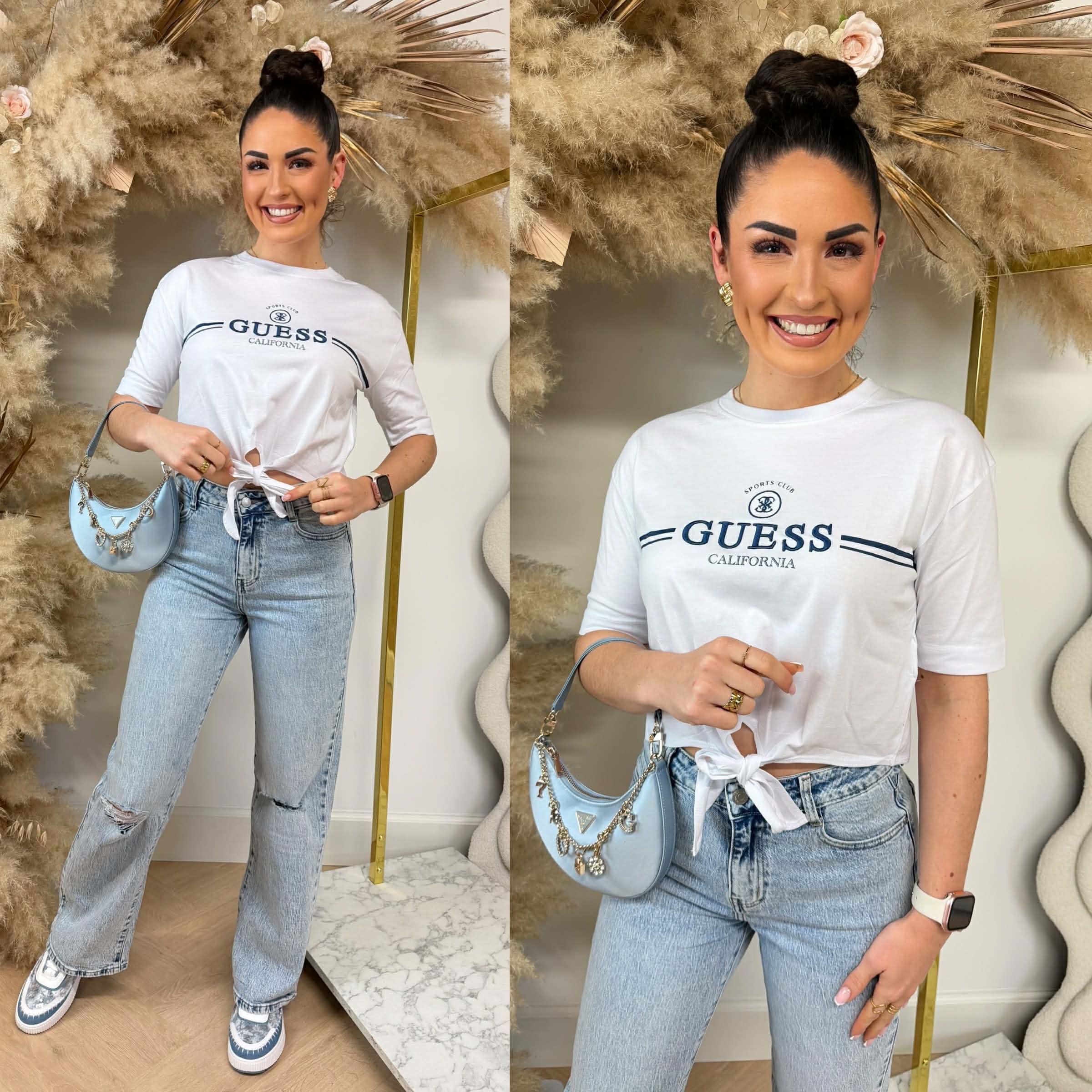 YEAH! We hebben zo'n GAVE collectie van GUESS! Deze collectie zit vol rhinestones, shiny materialen en prachtige details! Dit SUPER gave T-shirtje heeft een SUPER mooi logo voorop en een gave knoop.