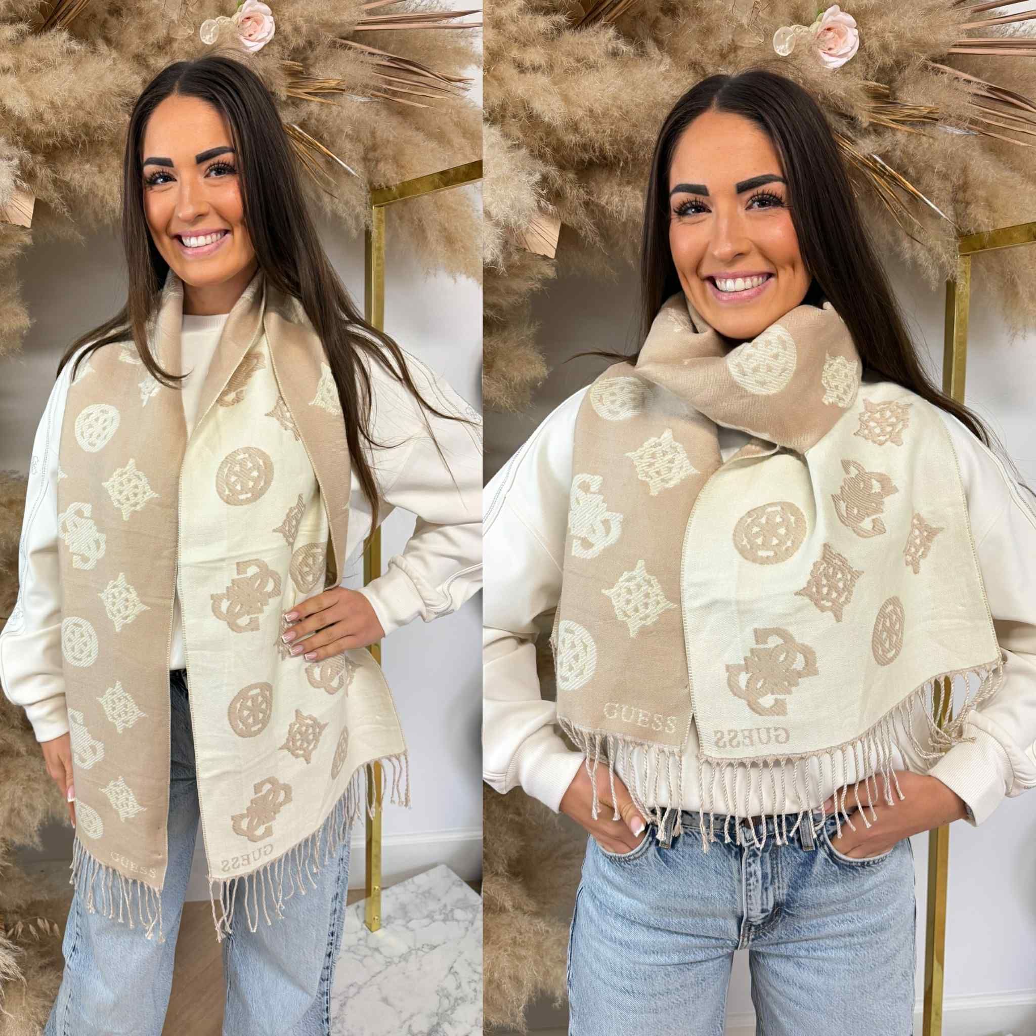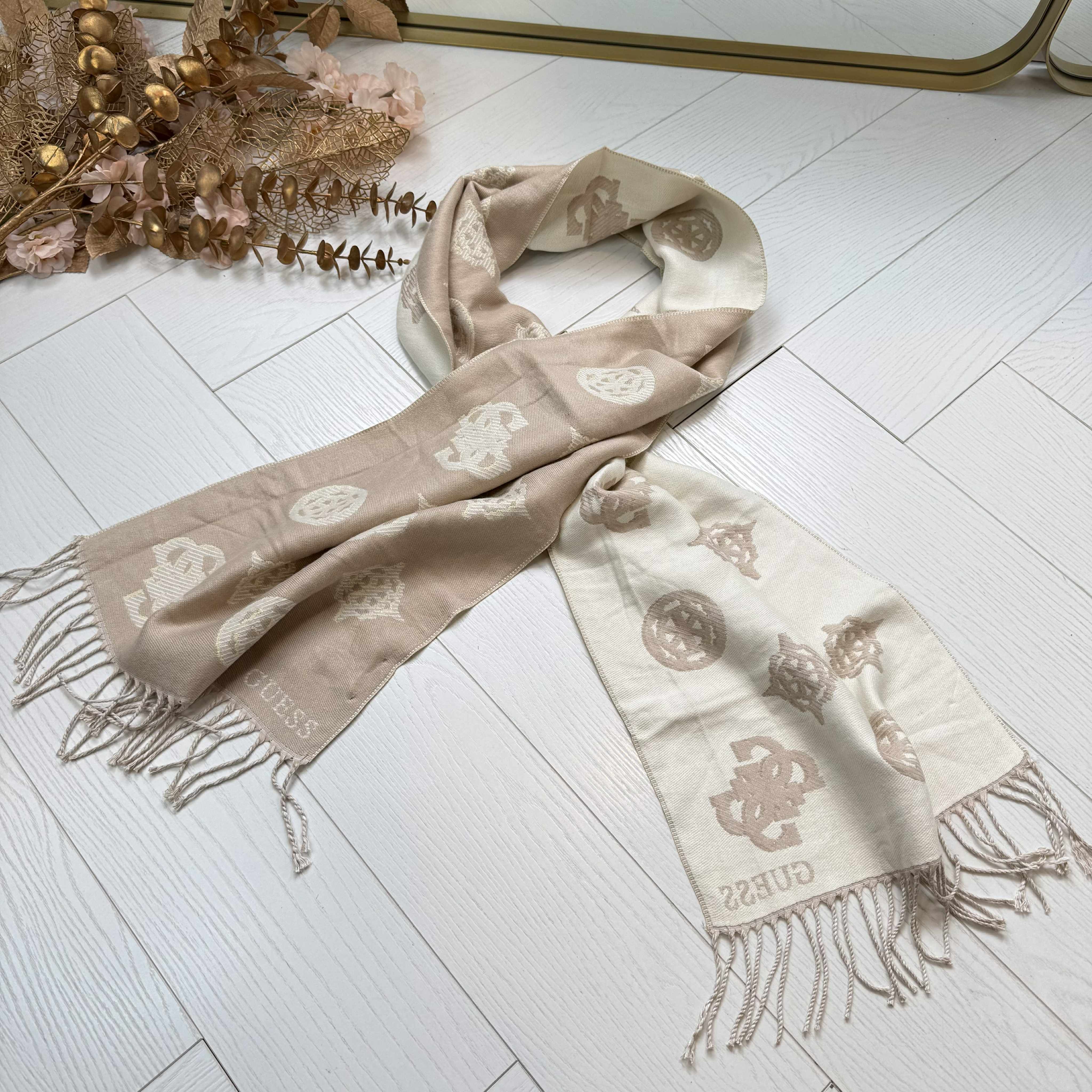 Super gave sjaal van het merk GUESS! Zit lekker zacht en past bij iedere outfit. De sjaal heeft leuke logos's met een goud lurex randje er omheen. Perfecte kleuren combinatie beige/ taupe, aan 2 verschillende kanten te dragen.