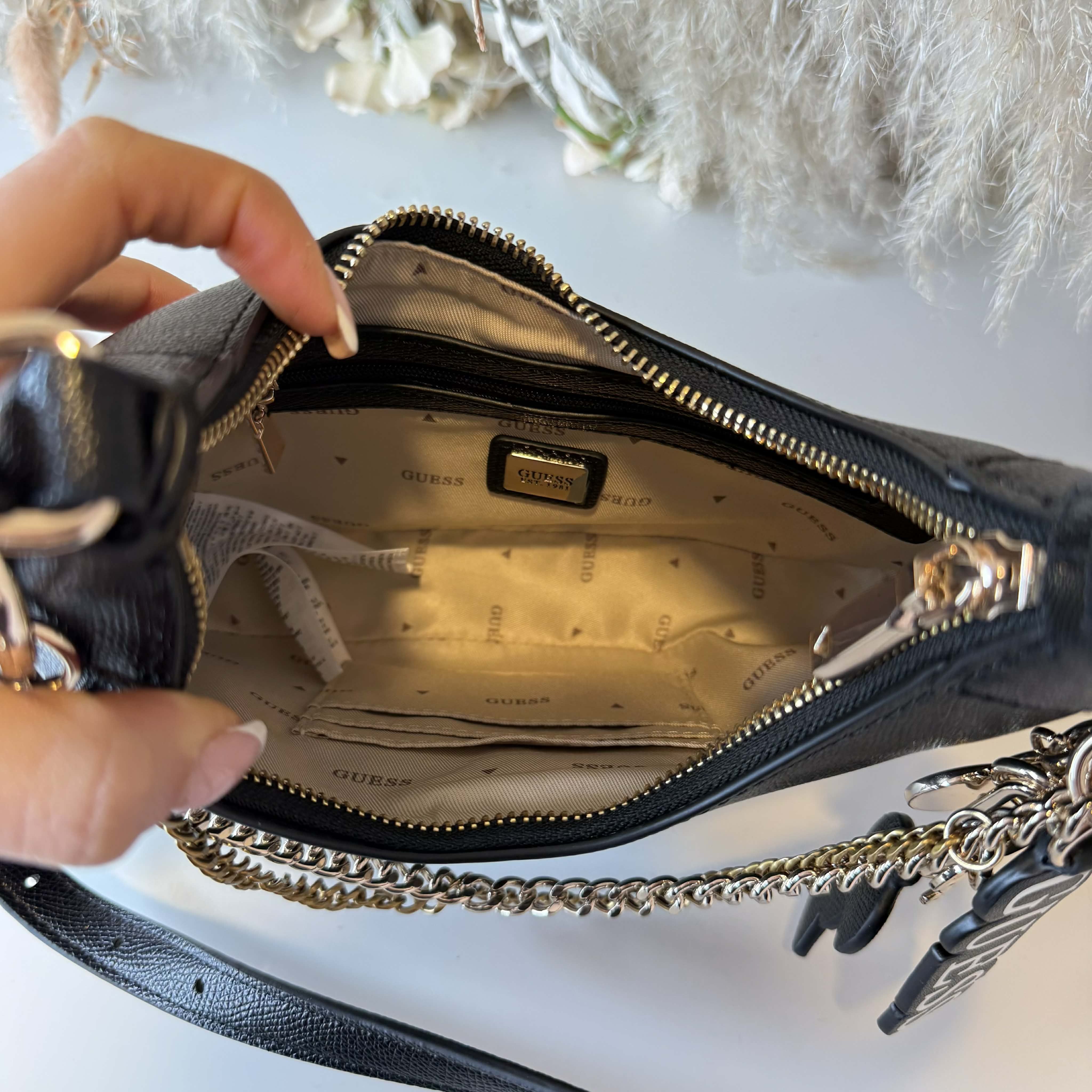 Super gave tas van het merk GUESS! De tas heeft een ritssluiting, zodat al je spulletjes veilig opgeborgen zitten. Binnen in de tas heb je nog een ritsvakje en een apart vakje om je spulletjes netjes te sorteren. Met een super gave tas chain al aan de tas verwerkt kan eraf gehaald worden! Echt een perfecte musthave!