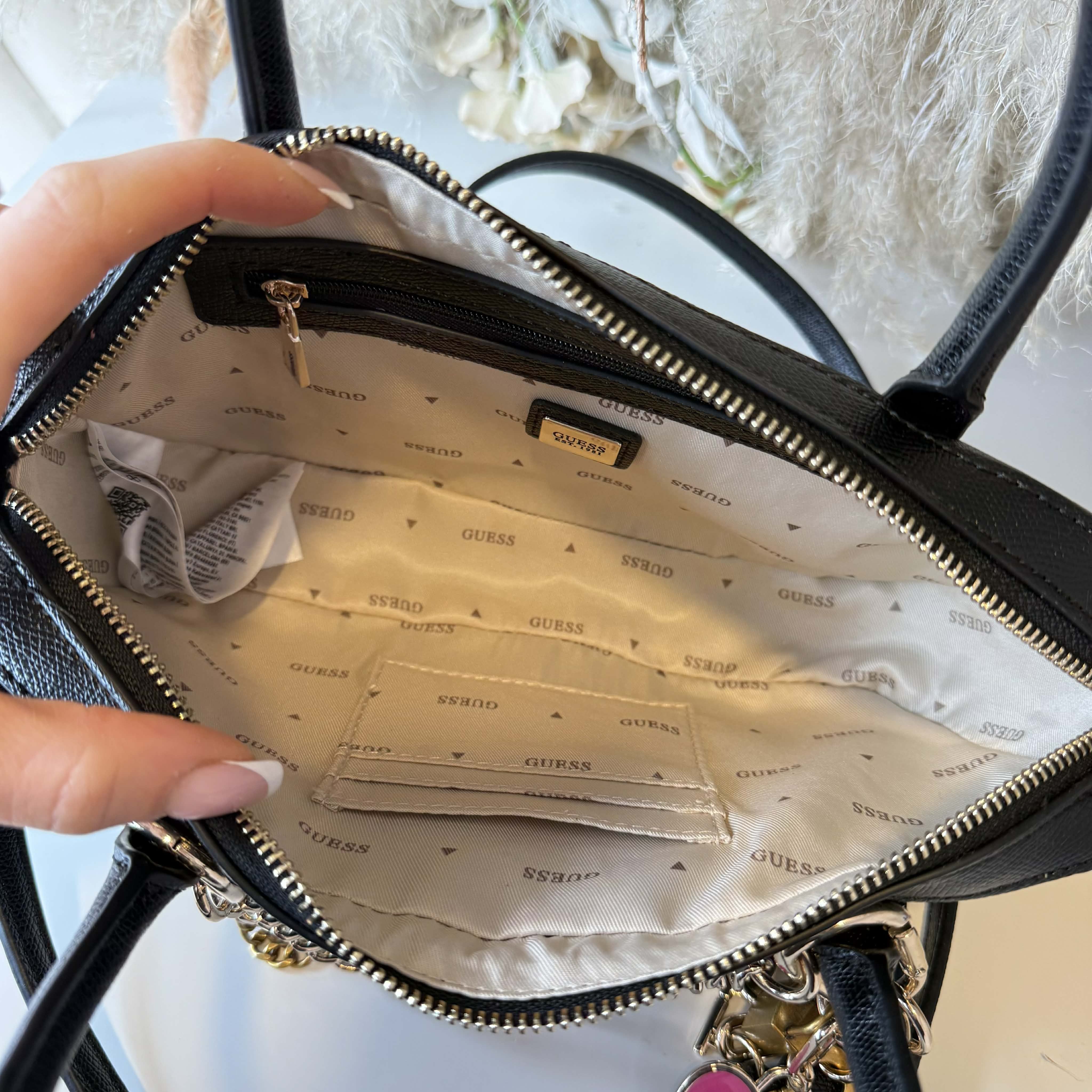 Super gave tas van het merk GUESS! De tas heeft een ritssluiting, zodat al je spulletjes veilig opgeborgen zitten. Binnen in de tas heb je nog een ritsvakje en een apart vakje om je spulletjes netjes te sorteren. Met een super gave tas chain al aan de tas verwerkt kan eraf gehaald worden! Echt een perfecte musthave!