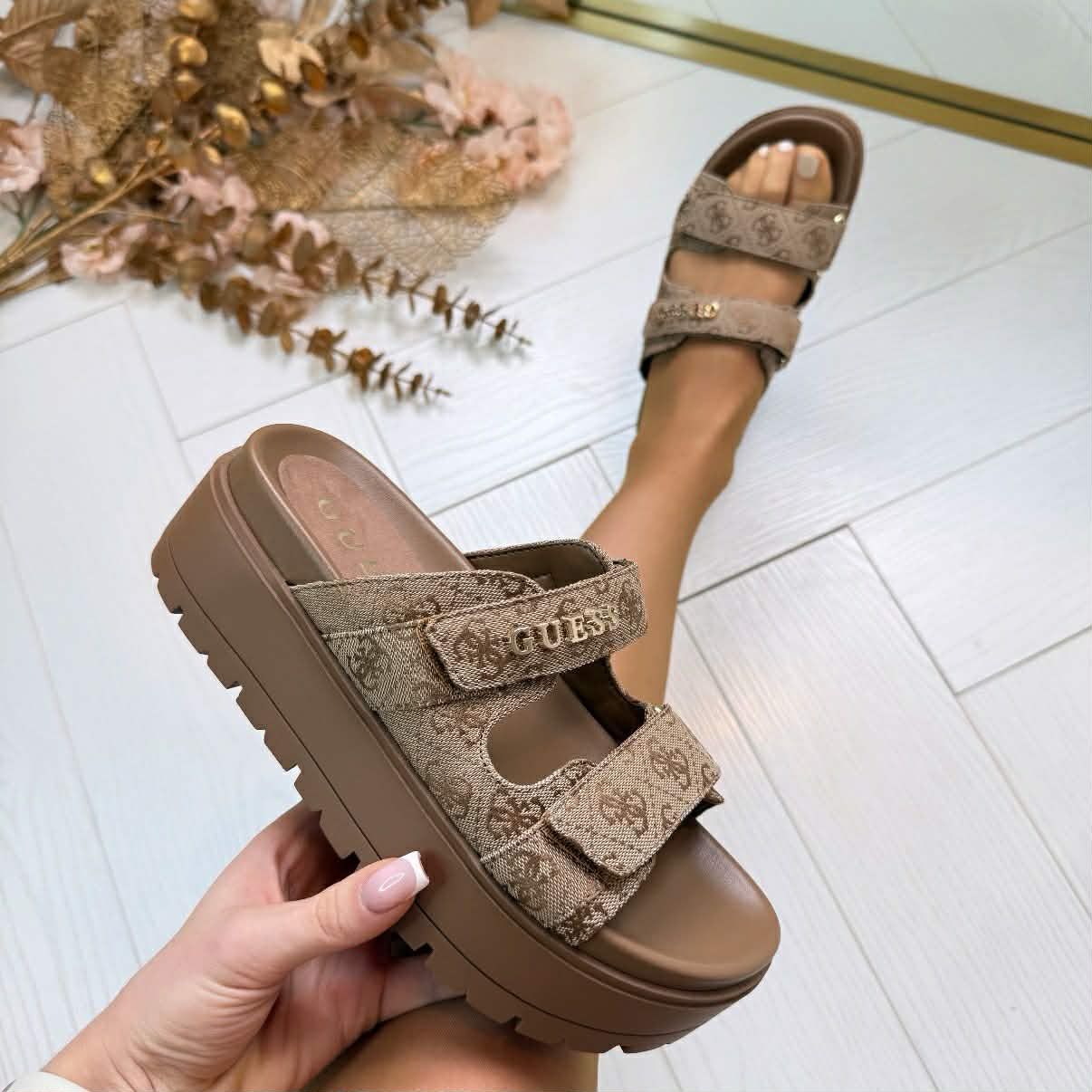 OHMYYYYYY, kijk nou!! Wat een GAVE slippers we binnen hebben van Guess! Ze hebben een plateau met een HEERLIJK voetbed!! Handig te verstellen met het klittenband en een PRACHTIG logo!