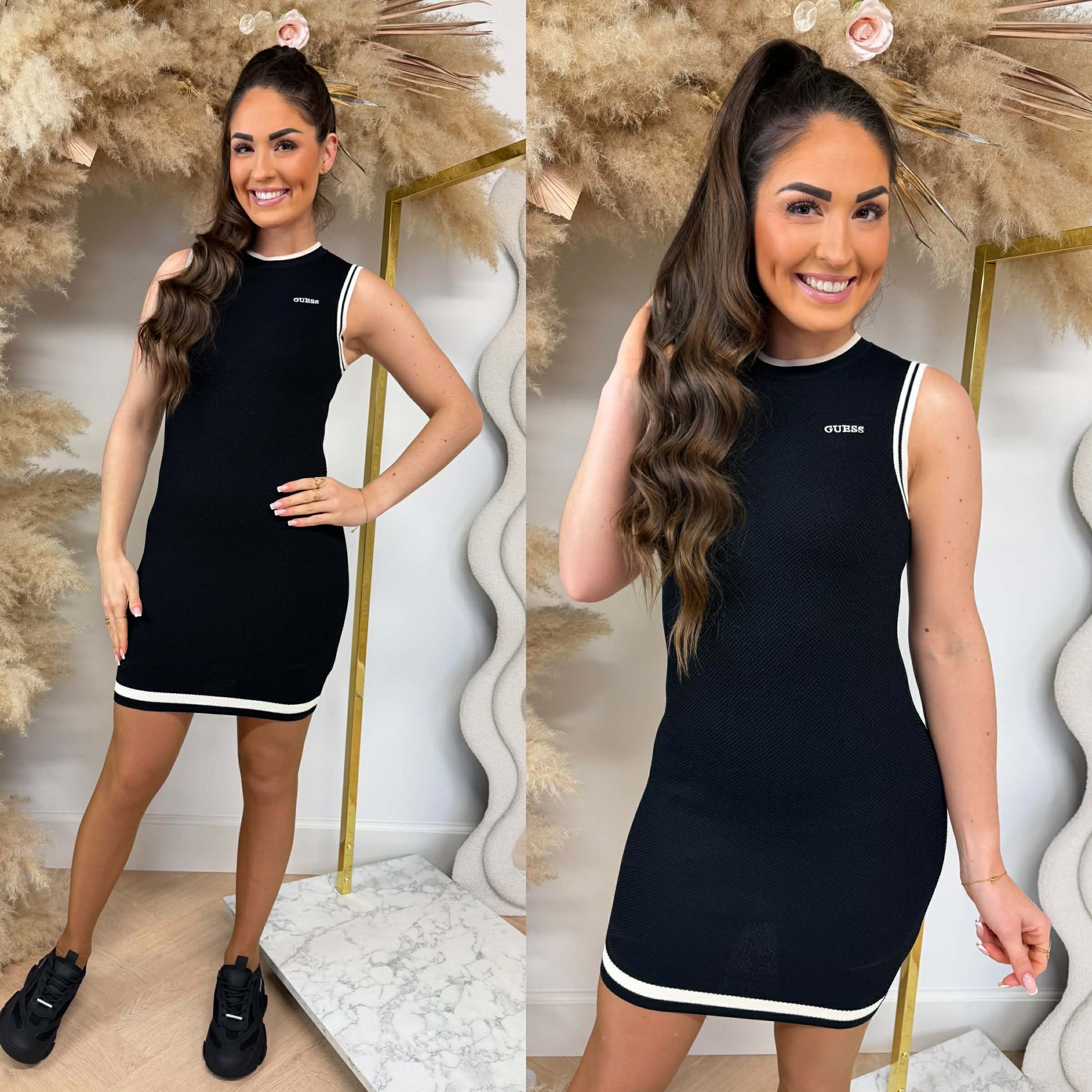 YEAH! We hebben zo'n GAVE collectie van GUESS! Deze collectie zit vol rhinestones, shiny materialen en prachtige details! KIJK nou toch eens wat een PRACHTIGE jurk we binnen hebben! Deze jurk is echt super CLASSY, prachtig materiaal en een leuke gekleurd streepje als detail!