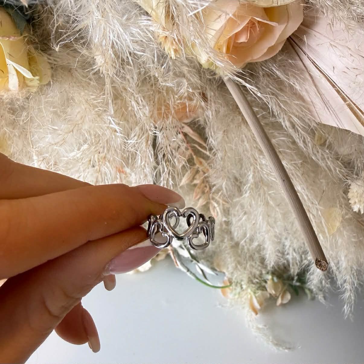 We hebben PRACHTIGE sieraden binnen! Deze ring heeft PRACHTIGE hartjes als detail! Combineer met de andere prachtige sieraden om je outfit echt HELEMAAL compleet te maken!