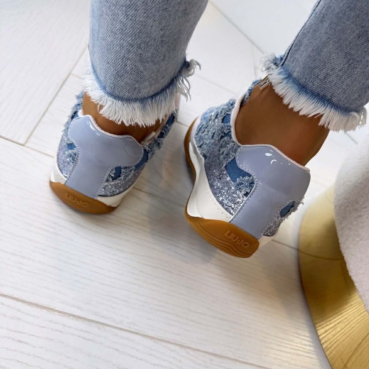 OMG!! De allernieuwste collectie van LIU JO nu bij ons verkrijgbaar! Hoe gaaf zijn deze sneakers met die gave strass steentjes en denim look?!
