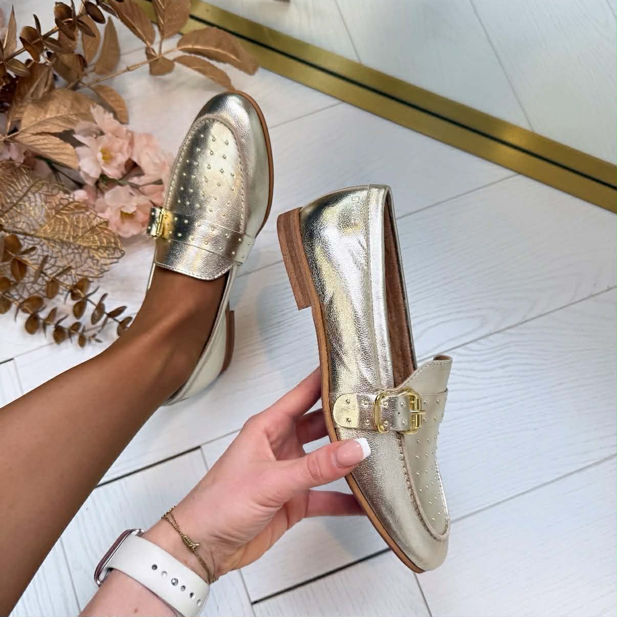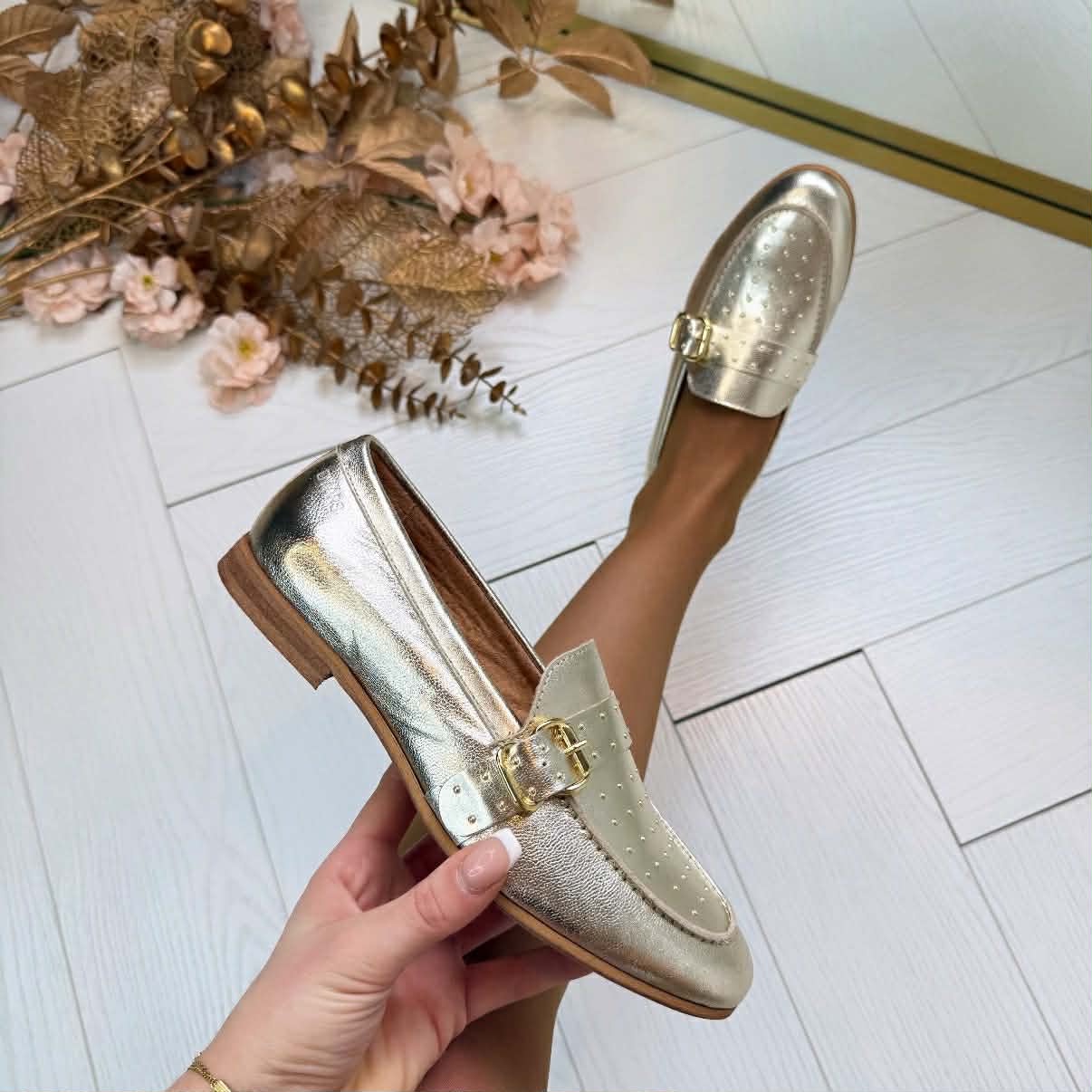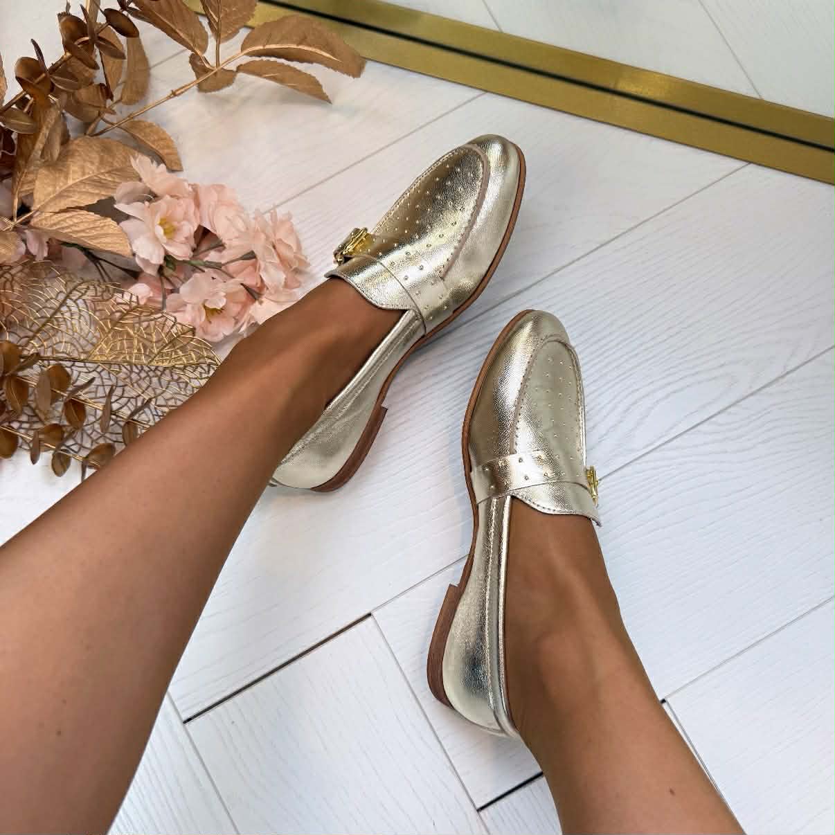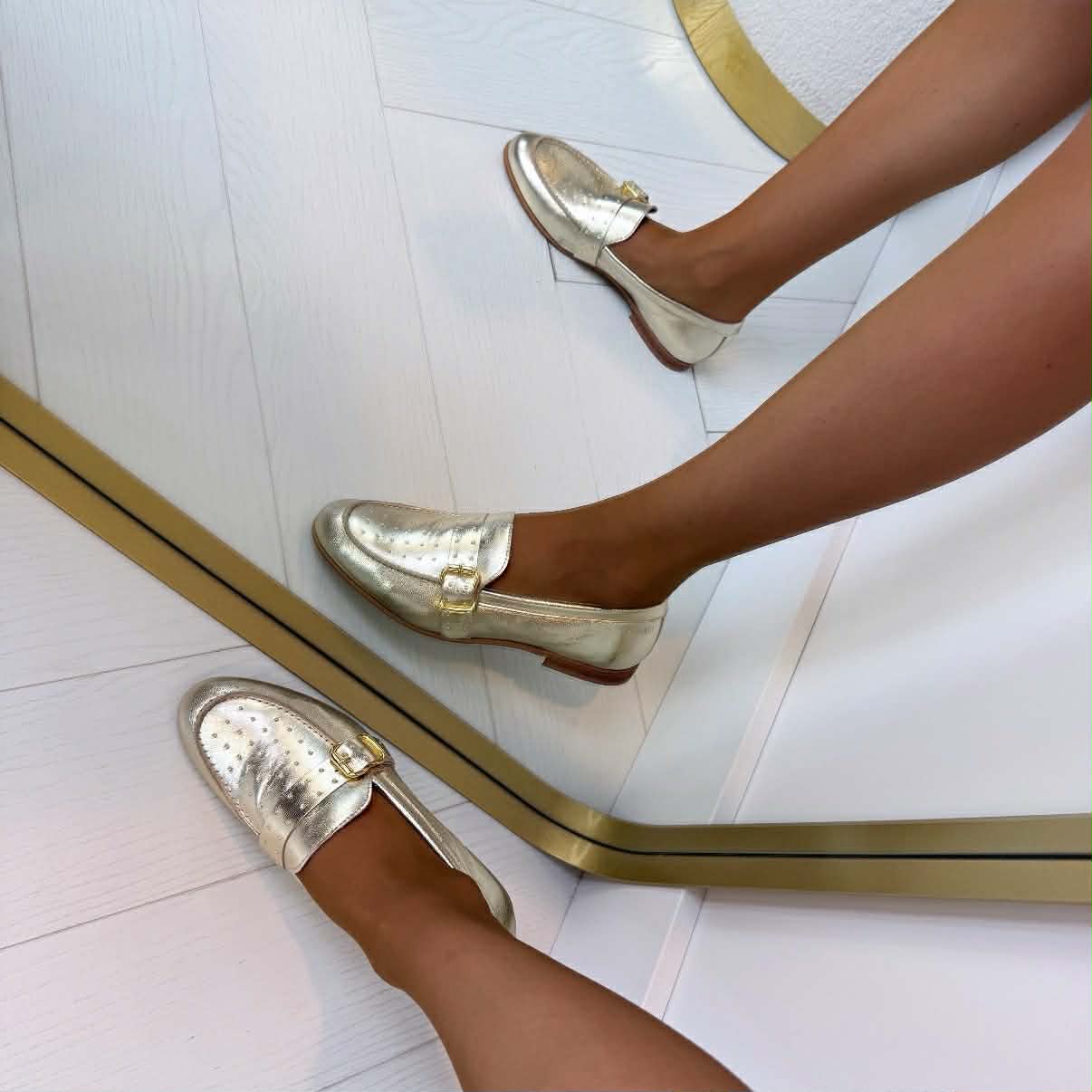 De Jay loafer is nieuw bij dwrs! Deze te gekke loafer met gouden studs op de voorkant is perfect voor de warme dagen. De Jay is aan de binnenkant van leer en aan de buitenkant gemaakt van metallic. Deze schoen staat leuk onder een linnenbroek of onder een lange jurk en hierdoor loop je op wolkjes.