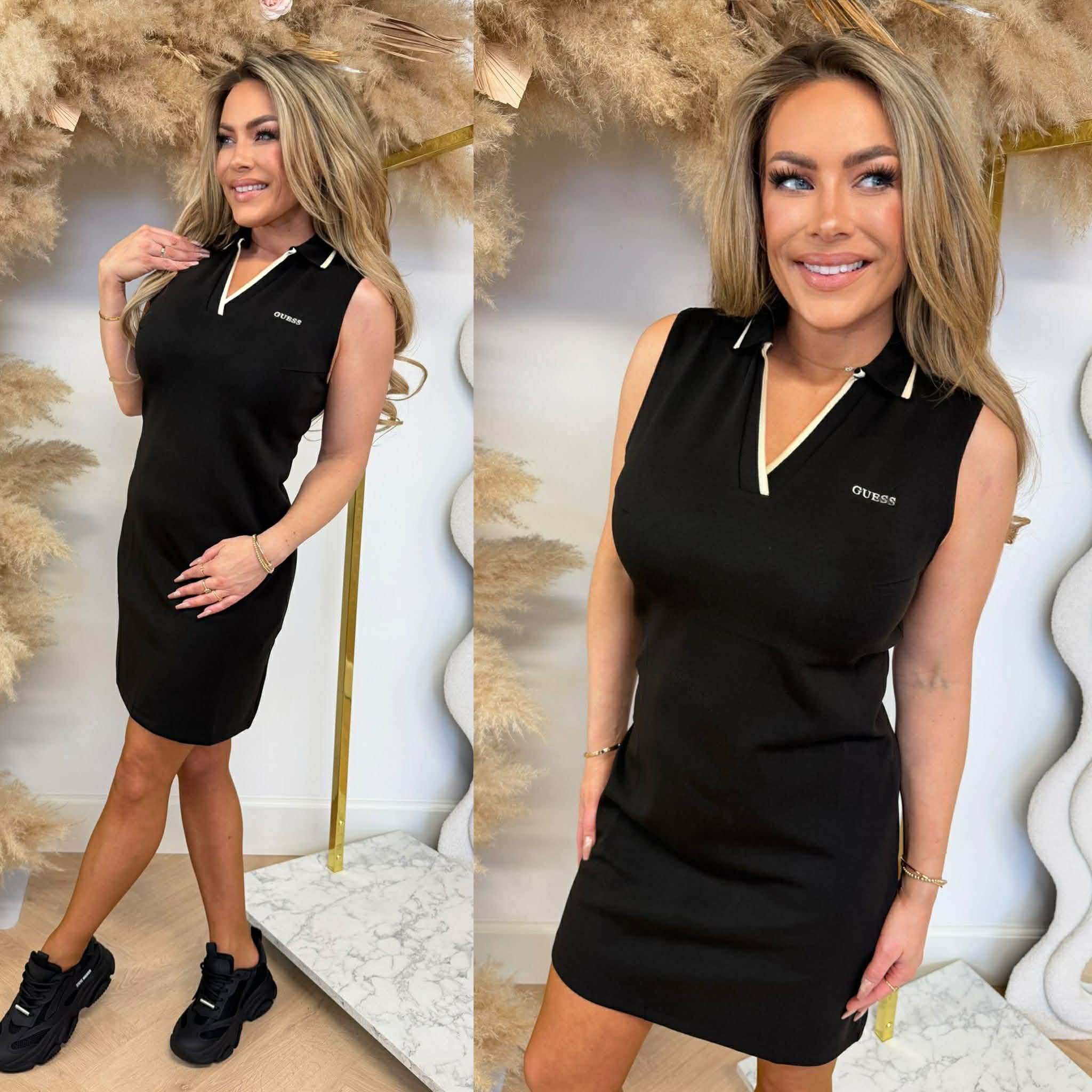 YEAH! We hebben zo'n GAVE collectie van GUESS! Deze collectie zit vol rhinestones, shiny materialen en prachtige details! KIJK nou toch eens wat een PRACHTIGE jurk we binnen hebben! Deze jurk is echt super CLASSY, prachtig materiaal en een v hals met kraagje als detail!