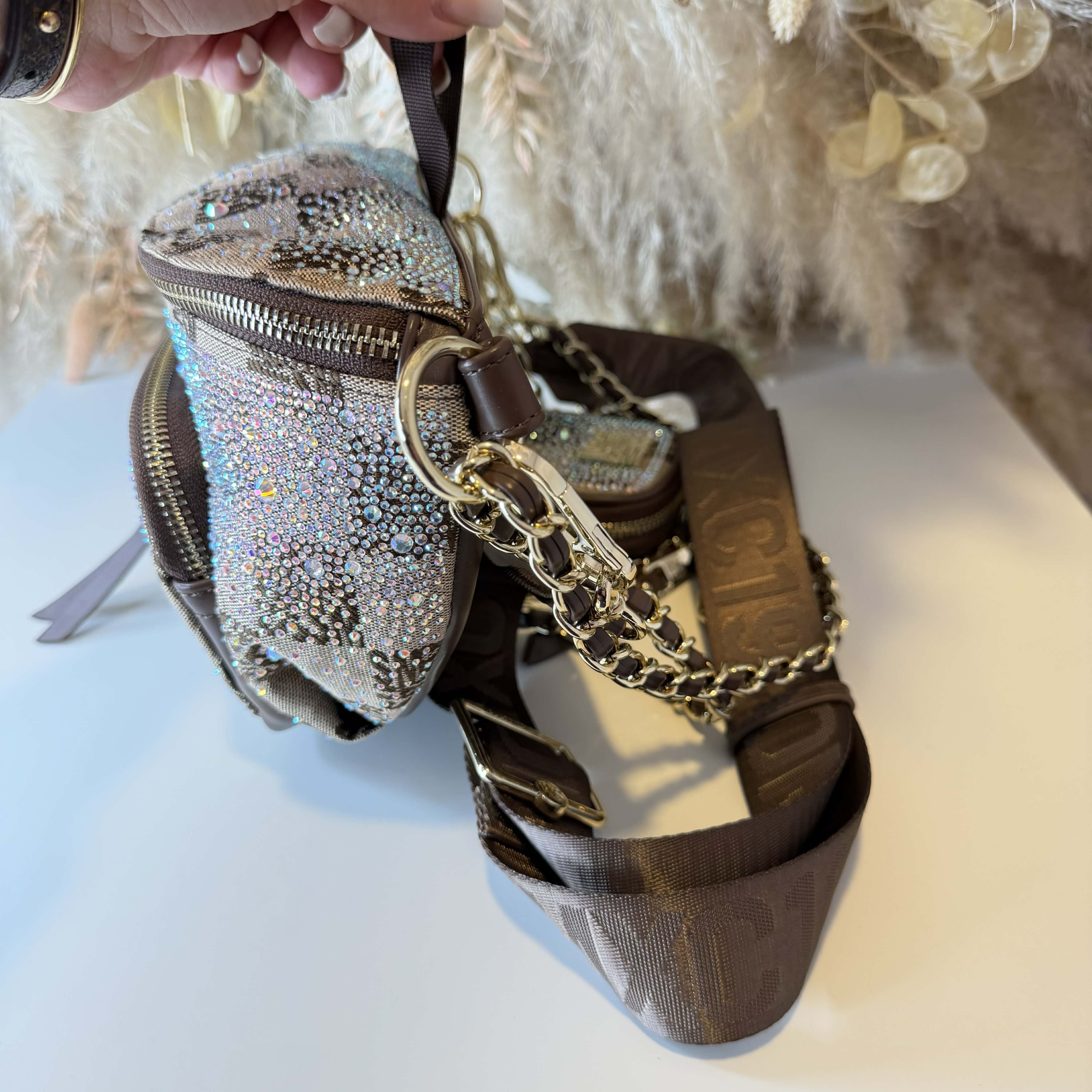 Meet our newest edition the BMAX! You can't miss out on this waist bag covered in rhinestones while the chain gives is an extra touch. This bag has multiple compartments to store all your necessities in a fashionable way.