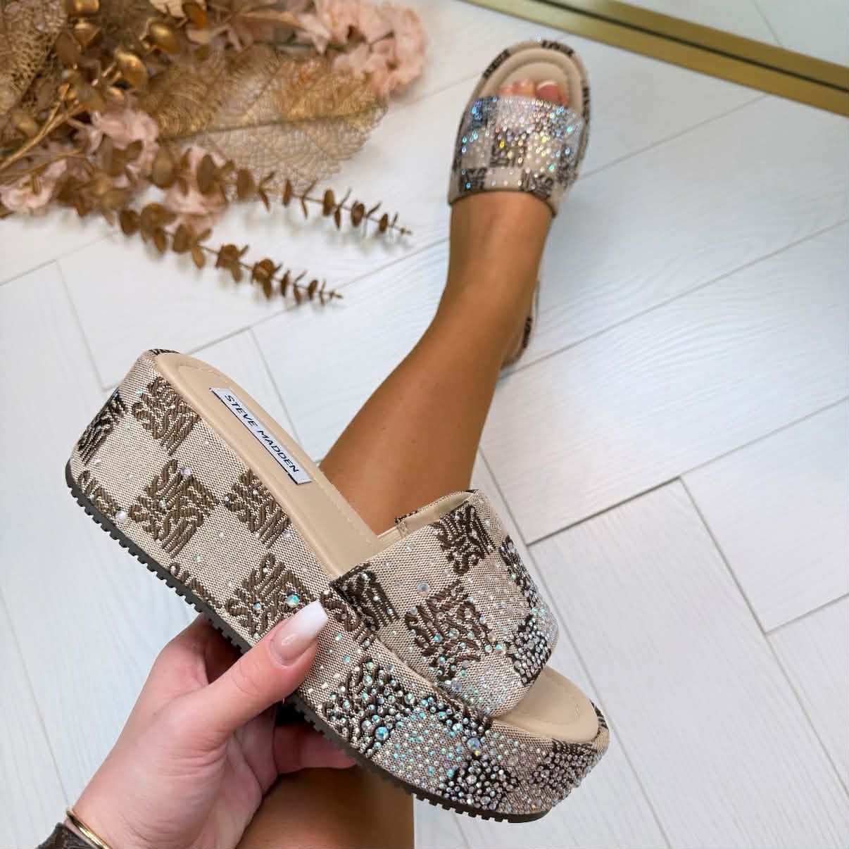 YAAAAYY, er is een Super gave nieuwe collectie van Steve Madden vol met rhinestones! Deze slipper heeft een gave plateau zool! Combineer het met een Sparkling nieuwe Steve Madden tas! Ze it heerlijk!